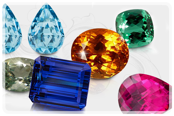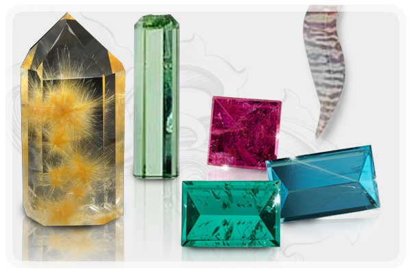 Aquamarin, Heliodor, Morganit, Beryll gelb, Tansanit, Turmalin, Peridot, Iolith, Granat, Feueropal, Edeltopas (natur und behandelt ), Amethyst, Citrin, Lemonquarz, Rutilquarz, Bergkristall und Rauchquarz